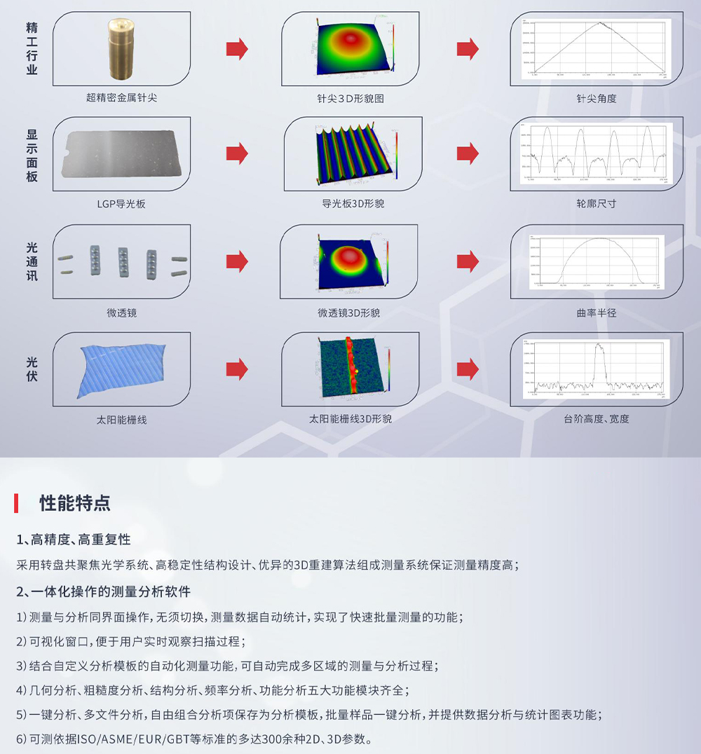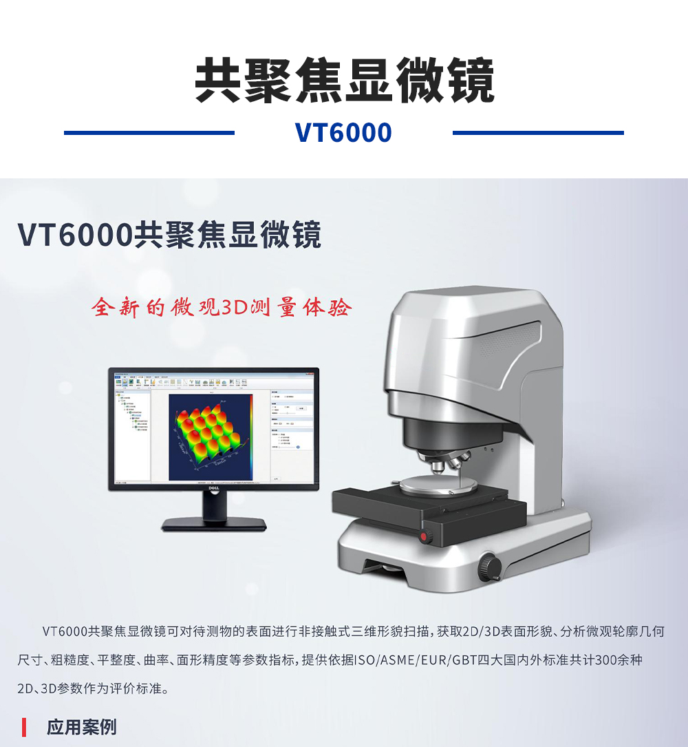 产品概述:VT6000共聚焦显微镜可对待测物的表面进行非接触式三维形貌扫描,获取2D/3D表面形貌、分析微观轮廓几何尺寸、粗糙度、平整度、曲率、面形精度等参数指标,提供依据ISO/ASME/EUR/GBT四大国内外标准共计300余种2D、3D参数作为评价标准。