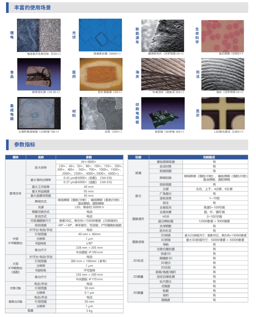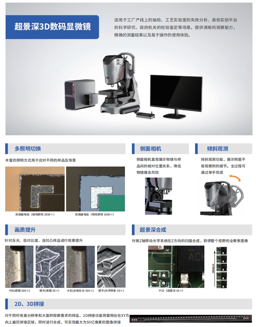 产品概述:适用于工厂产线上的抽检、工艺实验室的失效分析、高校实验平台的科学研究、政府机关的检验鉴定等场景。提供清晰的观察能力,准确的测量结果以及易于操作的使用体验。